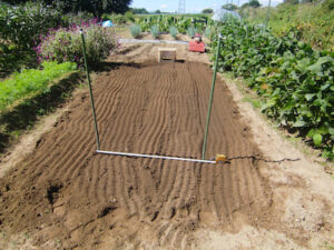 この作業に慣れれば、ひもの支柱が無くても、野菜の種類に合わせたベッド幅で畝を作れるようになり、マルチを使用しない限り自由なベッド幅が可能です。(マルチは幅の規格がある)